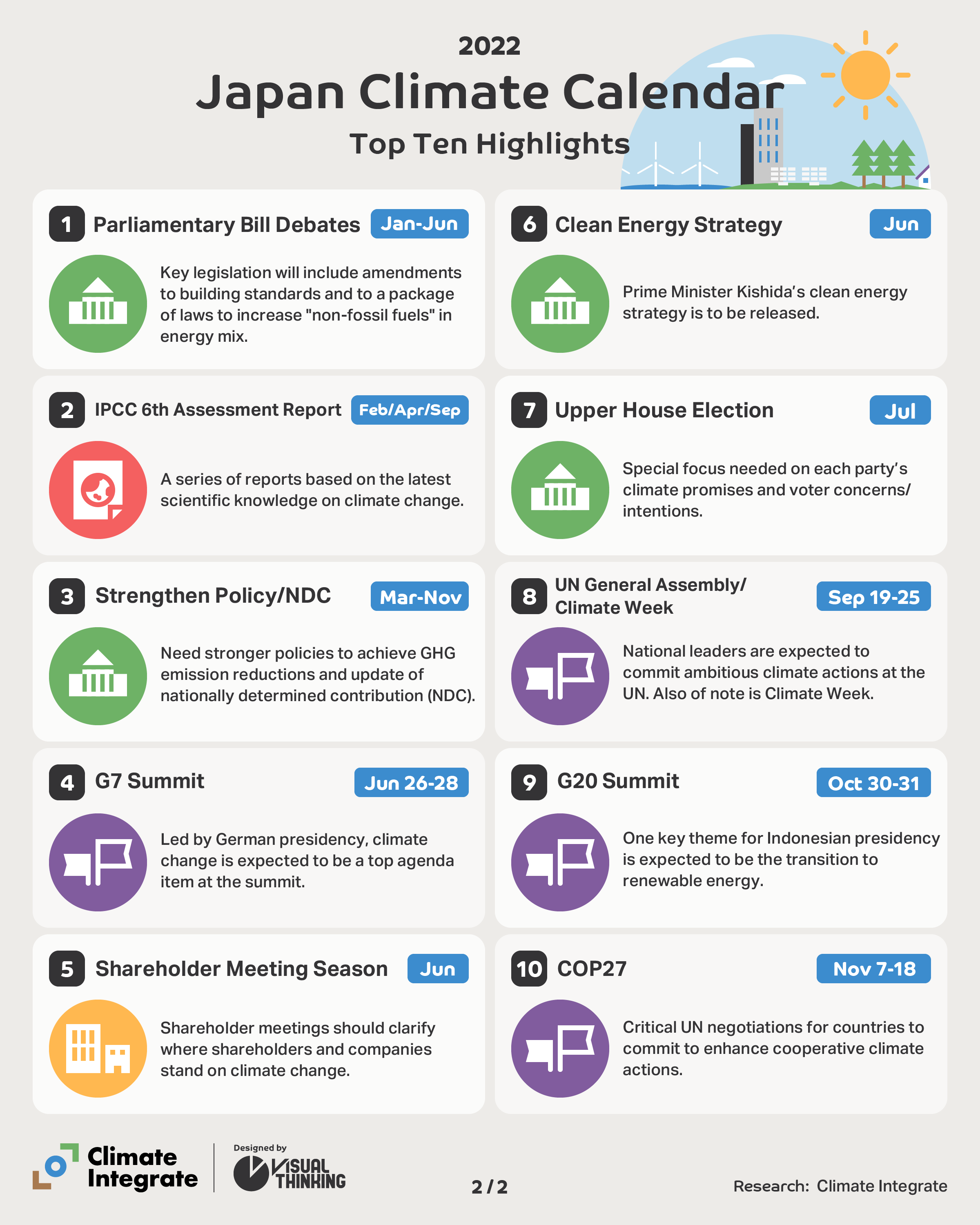 The year 2022 will therefore prove to be a real test of whether or not countries can strengthen their targets and policies, inject a sense of greater urgency, and speed up implementation to close the emissions gap prior to COP27. For Japan, the most important questions are whether the country can raise its ambition from the current target of a 46-50% reduction (from 2013) by 2030, and whether it can implement important policy changes and enhancements to achieve this.