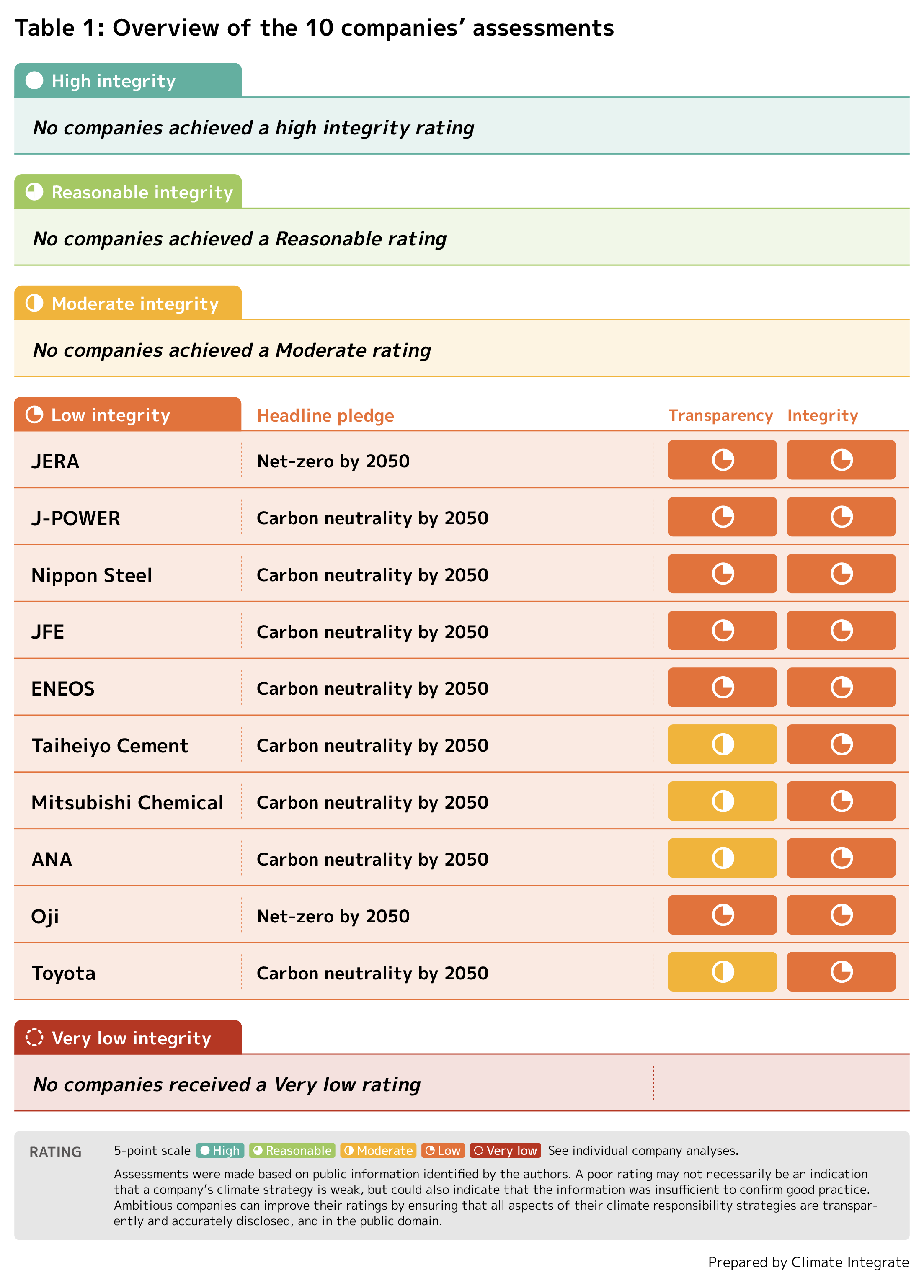 Companies assessed in this report include JERA and J-POWER (electric utilities), Nippon Steel and JFE (steel), ENEOS (oil and gas), Taiheiyo Cement (cement), Mitsubishi Chemical (chemical), ANA (transport services), Oji (paper and forestry), and Toyota (transport OEMs). The total scope 1 and 2 GHG emissions of these 10 companies accounted for 36% of Japan’s total GHG emissions in the 2020 fiscal year, which means that they have a significant responsibility for achieving net-zero emissions in Japan.