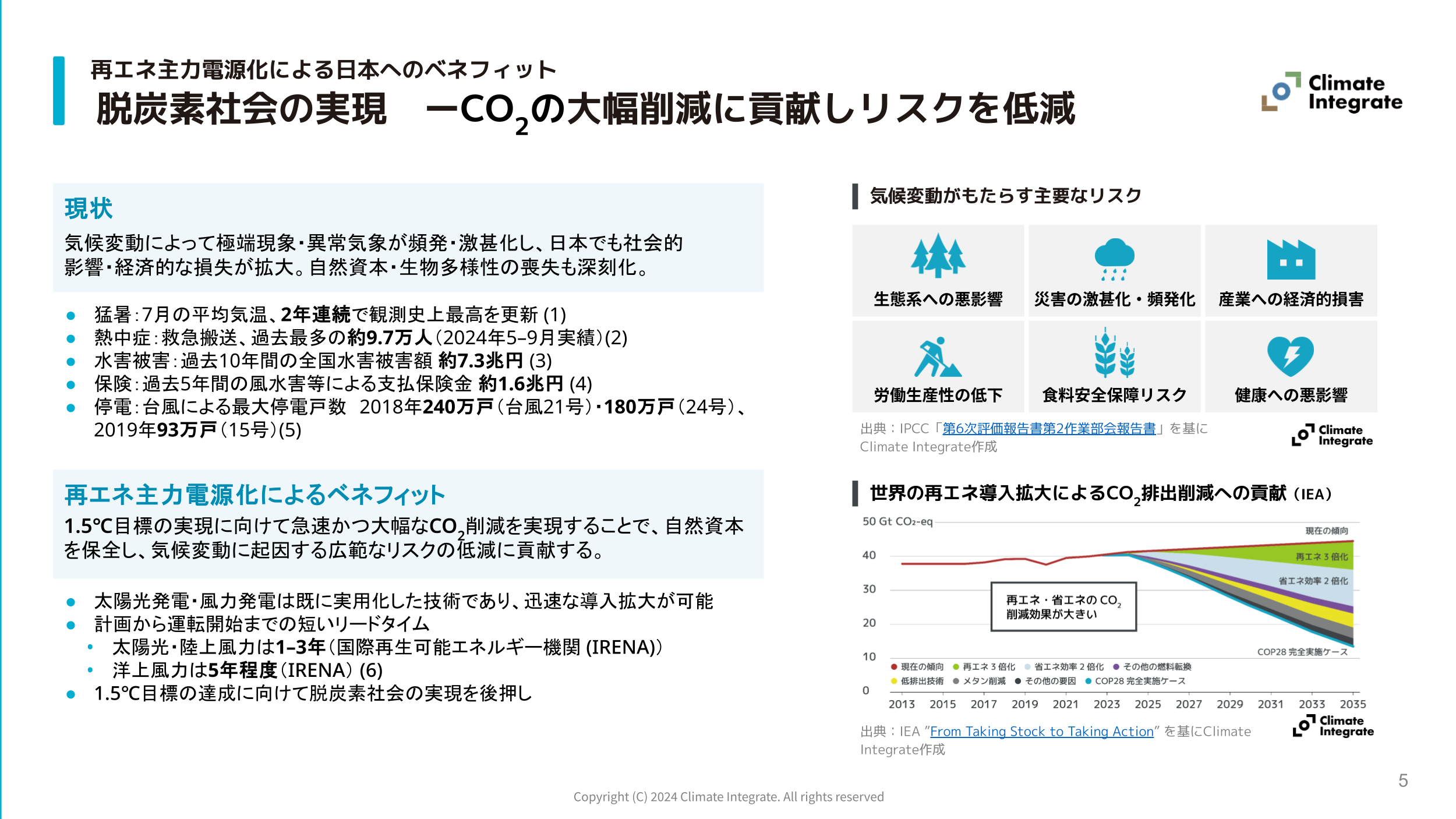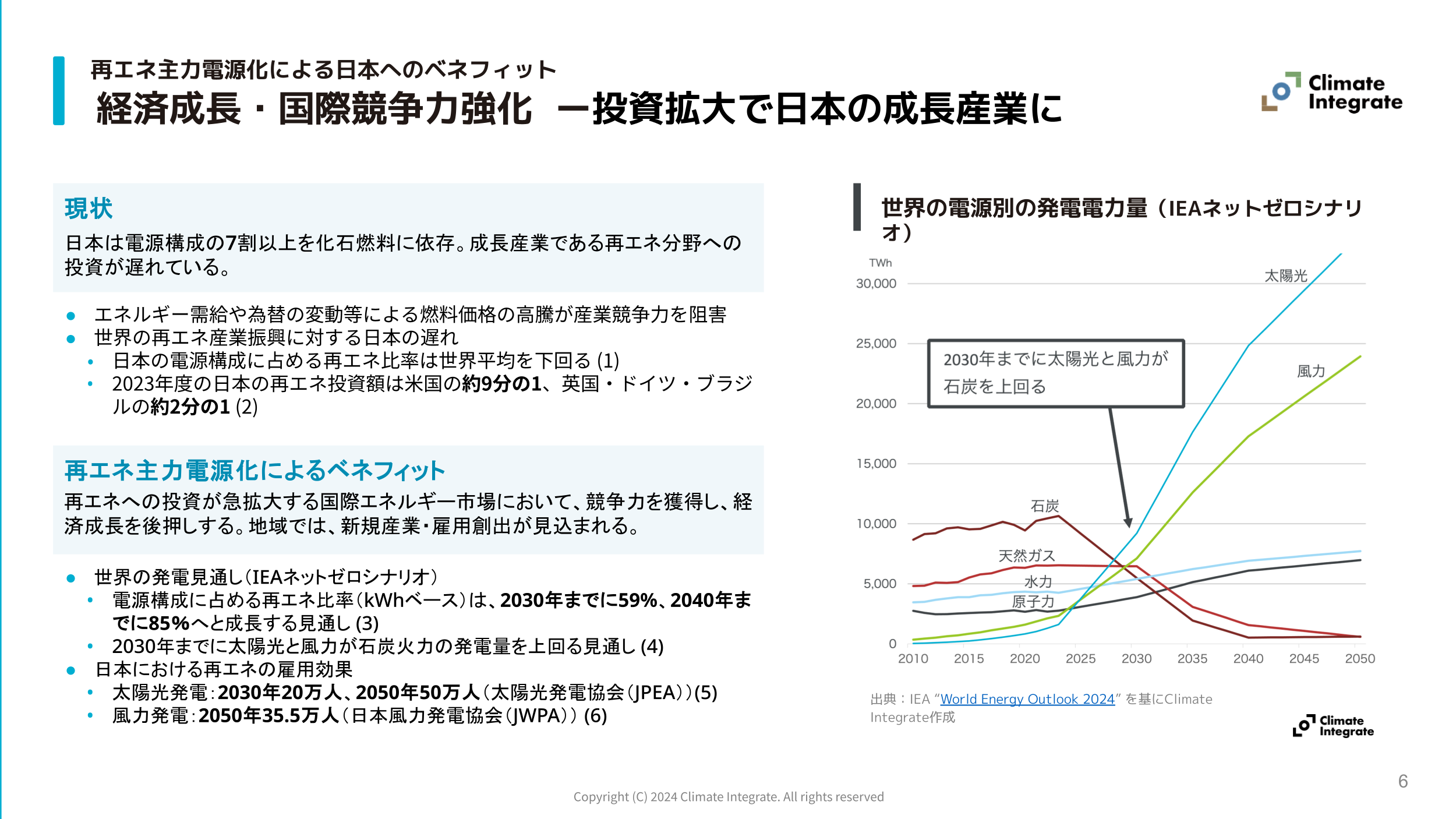 政府は再生可能エネルギー主力電源化を方針に掲げていますが、日本が再生可能エネルギーの利用を大きく進めることにより、国益・経済・地域・暮らしなどにどのような影響や意義があるのでしょうか。再エネ主力電源化を巡る論点として、再エネ供給力拡大の強みと、再エネ主力電源化のベネフィットをとりまとめました。