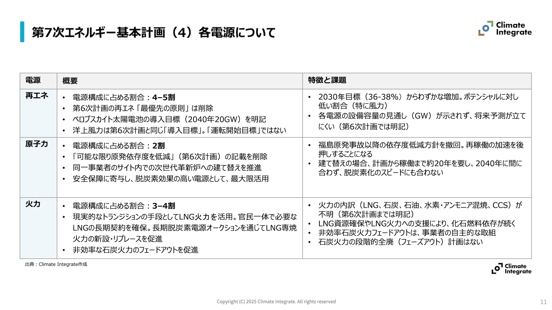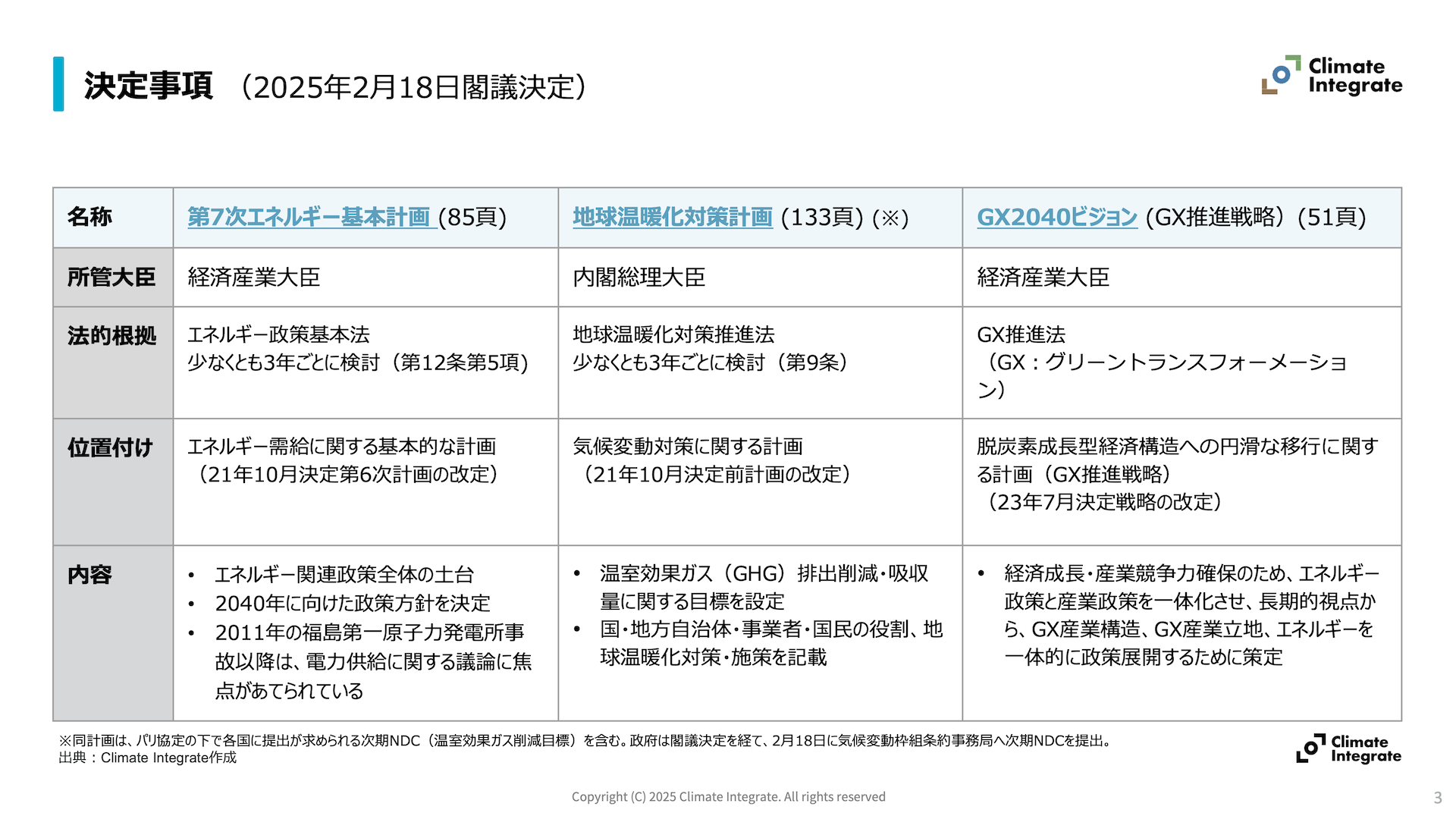 政府は2月18日、気候・エネルギー政策に関するエネルギー基本計画・地球温暖化対策計画・GX2040ビジョンの各案を閣議決定しました。3つの計画は、日本の気候変動対策やエネルギー関連政策全般に関わり、特に今回の第7次エネルギー基本計画(エネ基)は2040年度に向けた政策方針を決定しています。
