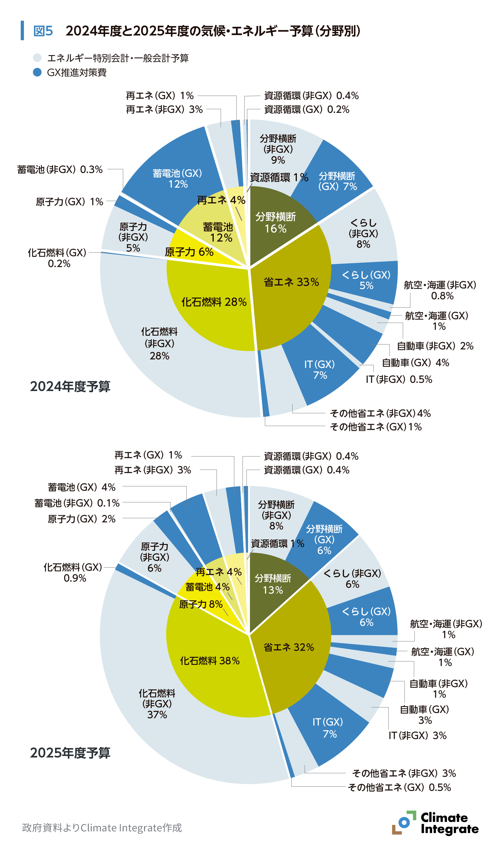 - 2025年度予算のうち、気候・エネルギー予算の総額は4兆6,710億円(予算全体の3.6%)で、2024年度より3,135億円増加した。GX推進対策費は、気候・エネルギー予算の32%(1兆4,968億円)を占め、2024年度よりも減額した。