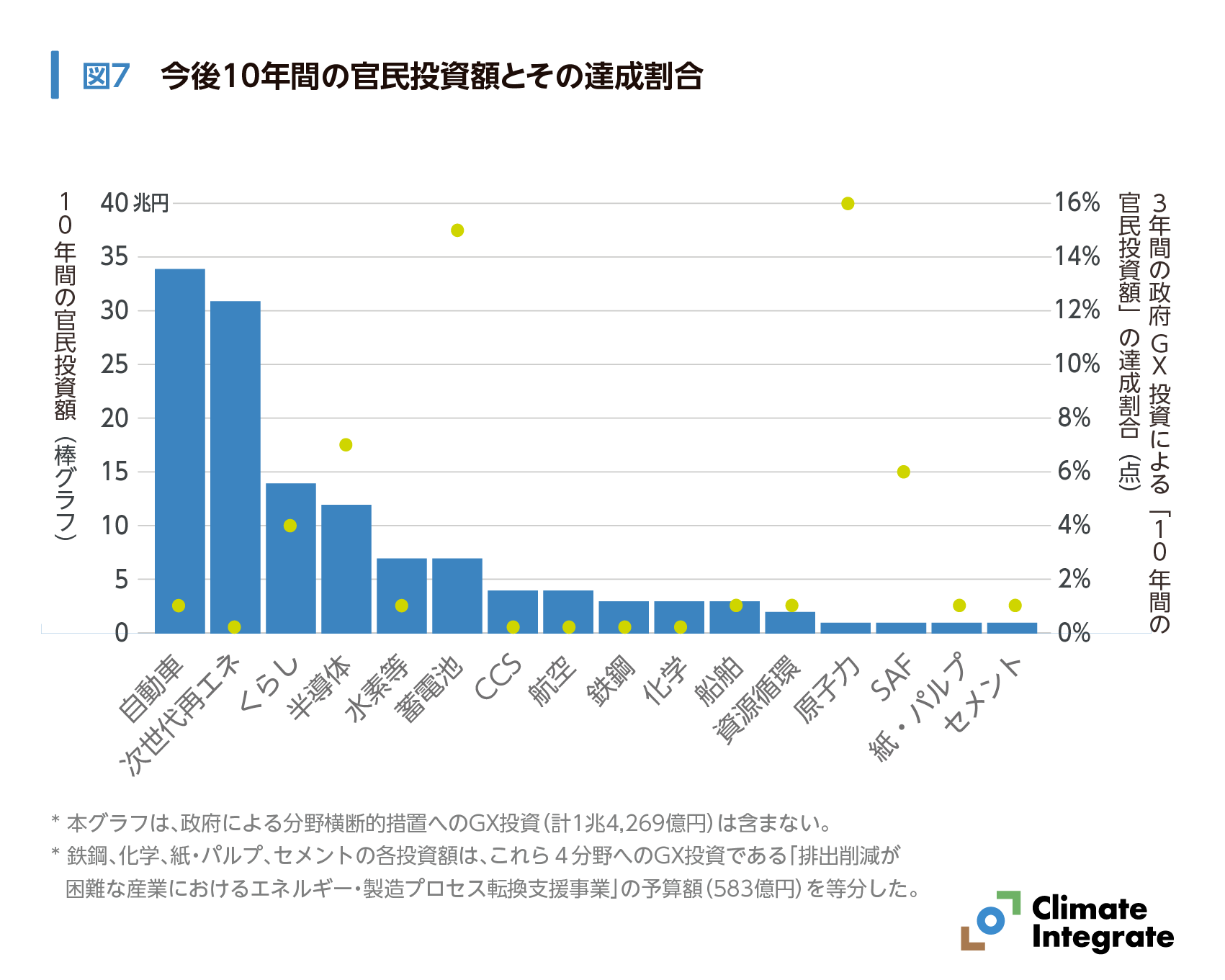 - 今後10年間の官民投資額と比べると、再エネへの現状の政府投資が非常に少ない一方で、蓄電池や原子力に多額の投資がなされている(図7・点)。