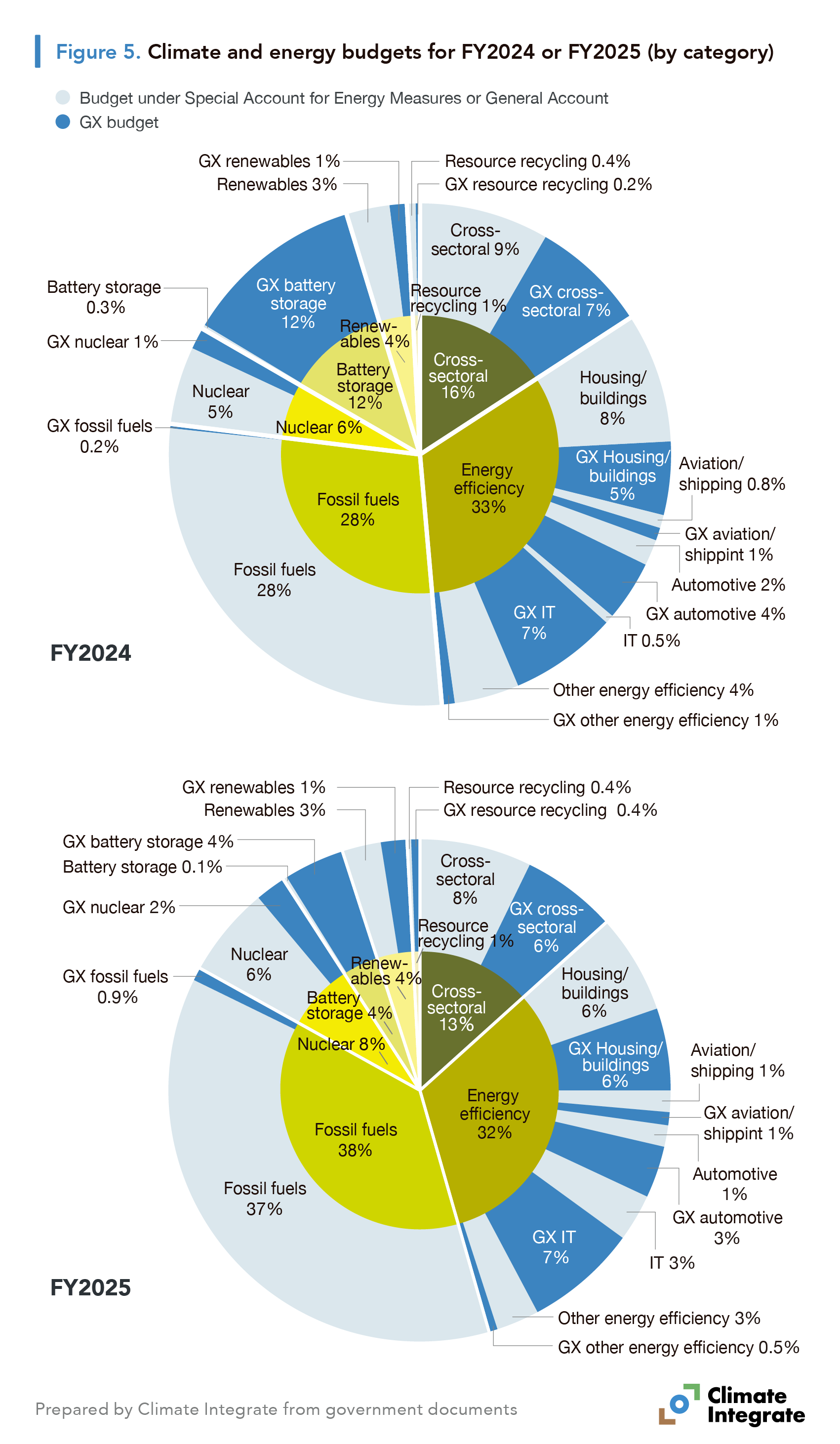 - By category, fossil fuels (including hydrogen and ammonia) increased from FY2024, accounting for 38% of the total. Energy efficiency accounts for 32 % of the total. On the other hand, the budget for renewables is very small, at only about 4% of the total. In the energy efficiency category, a large budget is allocated to housing/buildings, IT, and automotive. Budgets for fossil fuels and nuclear power increased from FY2024, while battery storage decreased.