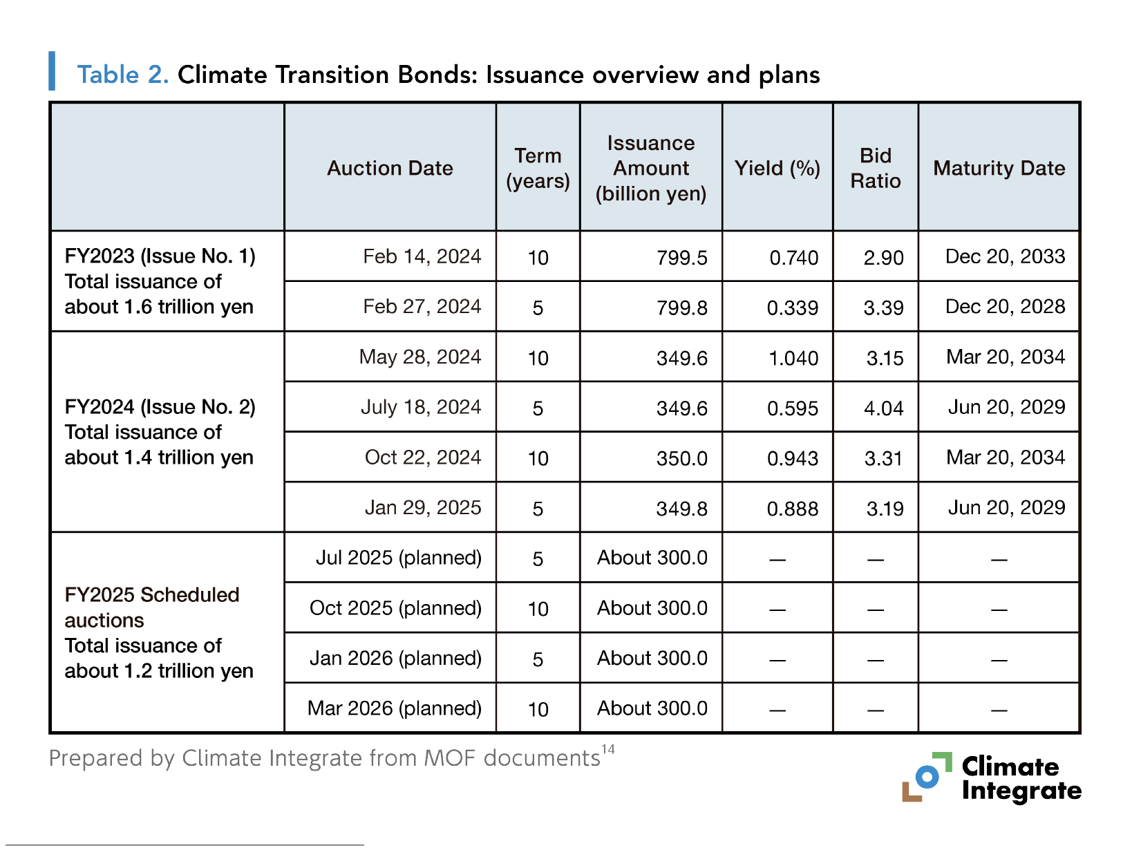 - The government plans to issue 20 trillion yen in GX Economy Transition Bonds over 10 years to fund projects under the GX budget. The first issuance of Climate Transition Bonds (GX Economy Transition Bonds issued as individual issuance) in FY2023 totaled about 1.6 trillion yen, followed by the second issuance in FY2024, totaling about 1.4 trillion yen. The plan for FY2025 is about 1.2 trillion yen. The annual issuance amount has been decreasing year by year.
