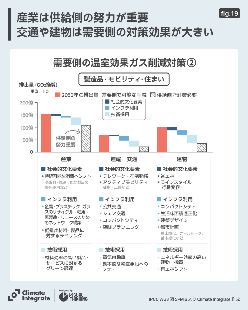 一方、産業部門は、金属・プラスチック・ガラスの再利用など(インフラ利用の改善)や、グリーン調達、エネルギー効率が高く炭素中立な材料利用など(技術採用)の対策が取れますが、全体の削減は3割に届かず、生産システムそのものの転換が求められます。