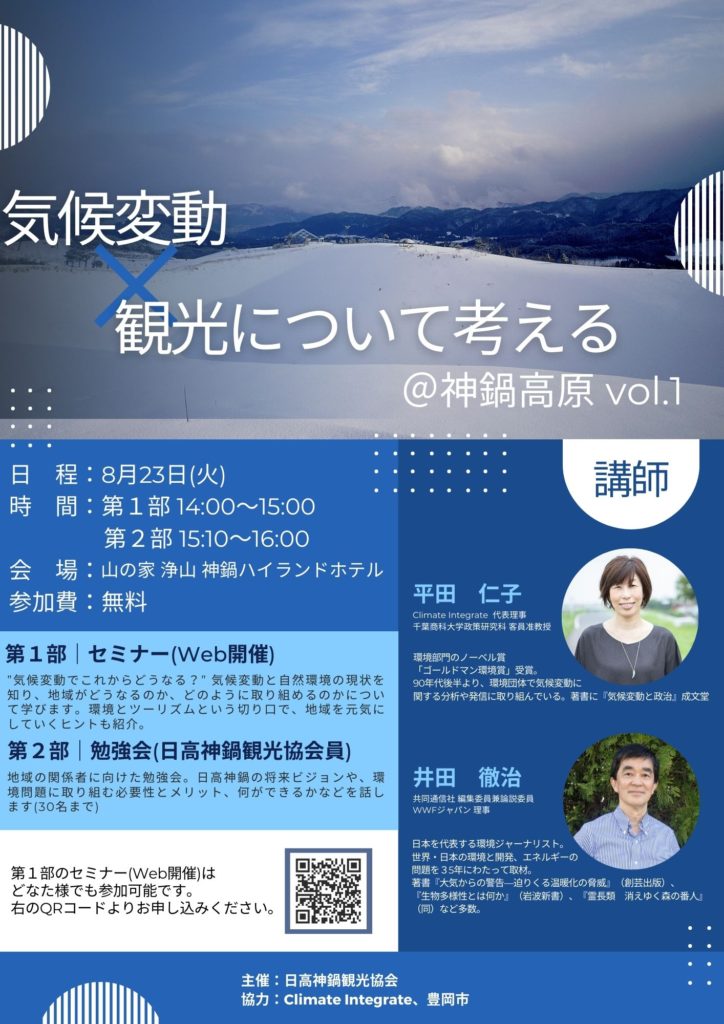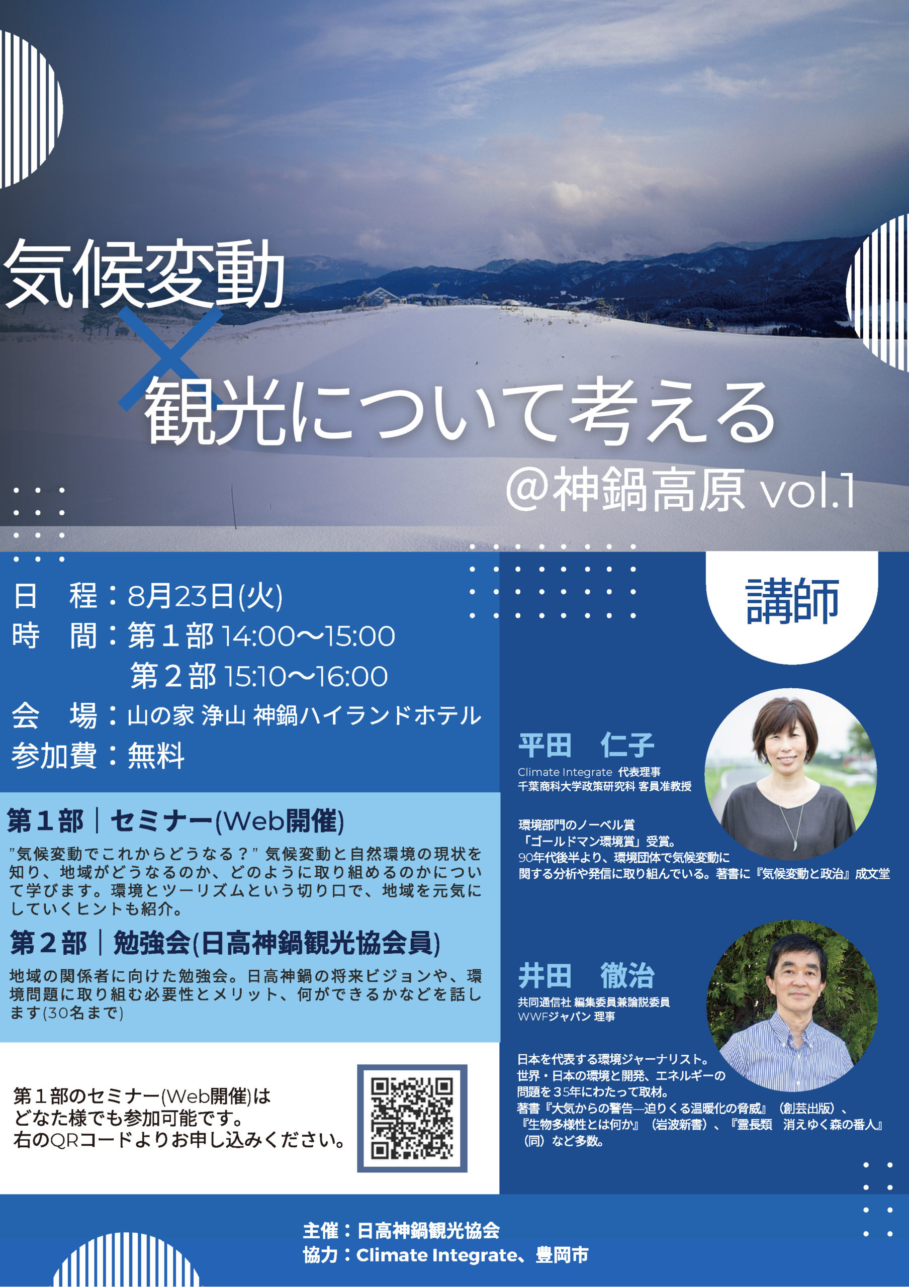 気候変動と観光を両軸で考えることで、神鍋地域の課題を先進的に解決する神鍋モデルに向け、まずは気候変動の現状がどうなっているのか、平田仁子さんと井田徹治さんをお招きしセミナーを開催します。